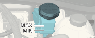 Періодично перевіряйте рівень гальмівної рідини в резервуарі (має перебувати між позначками «MIN» і «MAX»). Рівень знижуватиметься під час збільшення пробігу. Це нормальне явище, пов’язане зі зношенням гальмівних колодок.