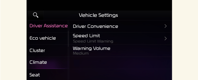 Los ajustes del vehículo en el sistema de infoentretenimiento proporciona opciones de usuario para una variedad de configuraciones, incluidas las funciones de bloqueo/desbloqueo de puertas, funciones convenientes, ajustes de asistencia al conductor, etc.