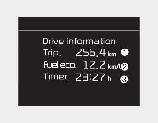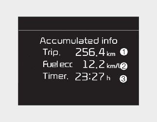 This display shows the trip distance (1), the average fuel efficiency (2), and the total driving time (3) information once per one ignition cycle.