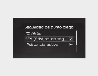 Con el botón ENGINE START/STOP (inicio/parada del motor) en la posición ON (activado), seleccione "Driver Assistance (Asistencia al conductor) → Blind-Spot Safety (Seguridad de punto ciego) → Safe Exit Assist (Asistencia de salida segura)" en el menú Ajustes para activar la asistencia de salida segura y cancele la selección para desactivar la función.