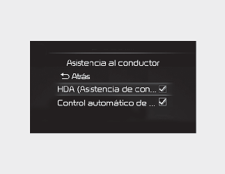 Con el botón ENGINE START/STOP (inicio/parada del motor) en la posición ON (activado), seleccione "Driver Assistance (Asistencia al conductor) → Driving Assist (Asistencia a la conducción) → Highway Speed Change (Cambio de velocidad en autopista)" en el menú Ajustes para activar el control de crucero inteligente basado en la navegación y cancele la selección para desactivar la función.