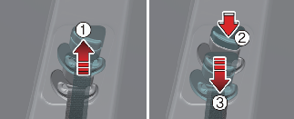 Pour relever le point d'ancrage, tirez-le vers le haut (1). Pour l'abaisser, poussez-le vers le bas (3) tout en appuyant sur le bouton de réglage de la hauteur (2).