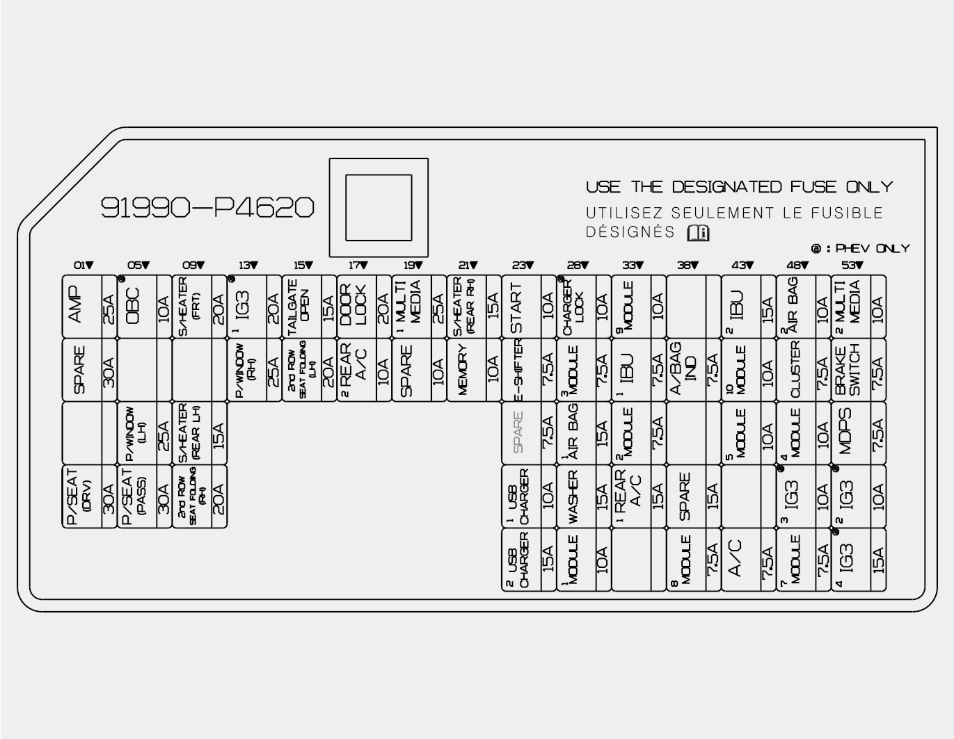 ICU Junction Block (Fuse - AMP, OBC, IG3 1, S/HEATER (FRT), P/WINDOW (RH), 2nd ROW SEAT FOLDING (LH)) |