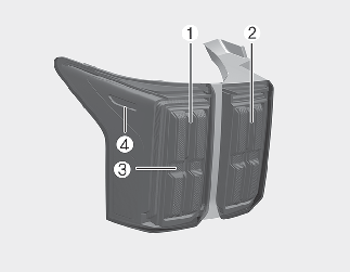 If the stop and taillamp (1), rear turn signal lamp (2), taillamp (3), and rear side marker lamp (4) do not operate, have your vehicle checked by a professional workshop. Visit an authorized Kia dealer.