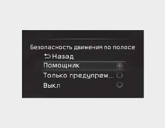 Если выбран пункт «Assist» (Помощь), функция будет автоматически помогать водителю в обнаружении ухода с полосы, чтобы предотвратить съезд автомобиля за пределы полосы движения.