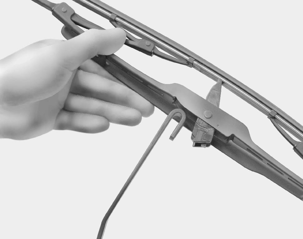 Установите новую щетку стеклоочистителя в боре, вставив центральную часть в паз, находящийся в ручке стеклоочистителя, и надавите до щелчка.
