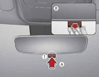 夜間駕駛時,朝您 (2) 所在的方向拉日間/夜間後照鏡調整桿以降低後方車輛大燈的眩光。