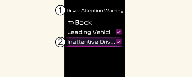 Si la fonction Avertissement d’attention du conducteur est sélectionnée, elle recommandera de prendre une pause lorsque le niveau d’attention chute en dessous d’un certain seuil.