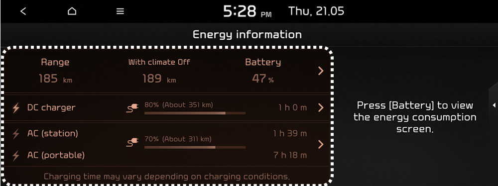 Vous pouvez vérifier l'autonomie possible, la puissance restante de la batterie et la durée de charge prévue pour chaque type de chargeur.