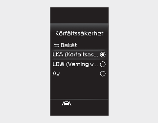 Om Avåkningsvarnare (Lane Departure Warning) väljs kommer körfältsassistans (Lane Keeping Assist) att varna föraren med en varningssignal när den känner av att bilen håller på att lämna körfältet. Föraren måste styra bilen.