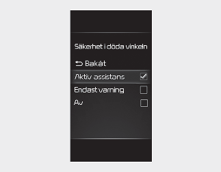 Om du väljer ‘aktiv assistans’ kommer kollisionsvarningen för döda vinkeln att varna föraren med ett varningsmeddelande, en varningssignal och bromsassistans kommer att tillämpas beroende på kollisionsrisknivån.