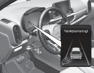 Varningsmeddelandet "Kör försiktigt" visas i klustret när systemet panikbromsar fordonet.