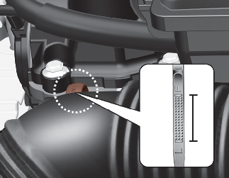Dra upp oljemätstickan igen och kontrollera nivån. Kontrollera att oljenivån är mellan linjen F-L och om den är nedanför L-linjen, tillsätt tillräckligt med olja för att föra upp oljan till F-linjen.