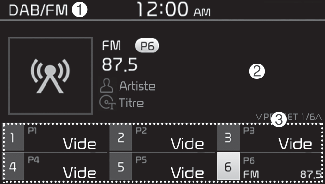 Balayage : le système recherche des stations radio avec un signal radio puissant et diffuse chaque station de radio pendant environ cinq secondes.