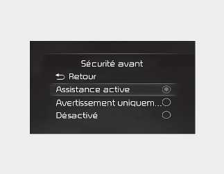 Avec le contacteur d'allumage ou le bouton ENGINE START/STOP (démarrage/arrêt du moteur) en position ON, sélectionnez "Réglages utilisateur → Assistance au conducteur → Sécurité avant" à l'écran LCD ou le système d'infodivertissement pour définir si vous souhaitez ou non utiliser chaque fonction.
