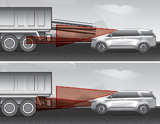 Lorsqu’un véhicule se déplace vers votre voie à partir d’une voie adjacente, il ne peut pas être détecté par le capteur tant qu’il n’est pas dans la portée de détection de celui-ci. L’Assistance à l’évitement de collision avant pourrait ne pas détecter immédiatement le véhicule lorsqu’il change brusquement de voie. Dans ces circonstances, vous devez maintenir une distance de freinage sécuritaire et, si nécessaire, garder le contrôle de votre véhicule et appuyer sur la pédale de frein pour ralentir et maintenir une distance de sécurité.