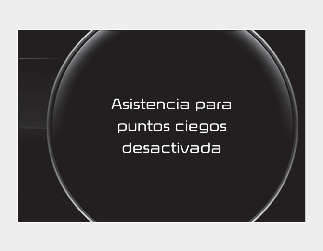 Al activar la asistencia de prevención de colisión en punto ciego o al volver a arrancar el vehículo con esta función activada, el indicador luminoso de los retrovisores laterales aparecerá durante aproximadamente 3 segundos. Al volver a arrancar el vehículo con la asistencia de prevención de colisión en punto ciego desactivada, aparecerá el mensaje de advertencia en el tablero de instrumentos.