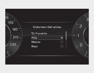Volumen de aviso: Seleccione "Ajustes del usuario → Asistencia al conductor → Volumen de aviso" en el tablero de instrumentos o "Ajustes → Vehículo → Asistencia al conductor → Métodos de aviso" en el sistema de infoentretenimiento.