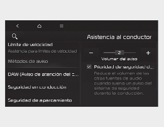 Prioridad de seguridad en la conducción: Seleccione "Ajustes → Vehículo →Asistencia al conductor → Métodos de aviso → Prioridad de seguridad al volante" en el sistema de infoentretenimiento. Para una conducción segura, se reducirá temporalmente el volumen de audio para avisar al conductor con un sonido de advertencia.