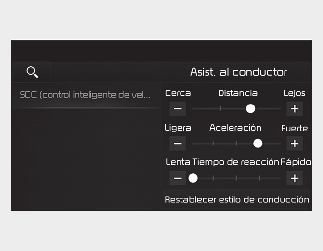 Con el vehículo encendido, seleccione "Ajustes del usuario → Asistencia al conductor → Control de crucero inteligente" en la pantalla LCD o seleccione "Ajustes → Vehículo → Asistencia al conductor → Confort de conducción → Control de crucero inteligente" en el sistema de infoentretenimiento para ajustar la distancia, la aceleración y la velocidad de reacción.