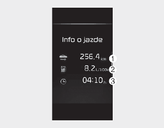 Na tomto displeji sa zobrazí celková vzdialenosť jazdy (1), priemerná spotreba paliva (2) a celkový čas jazdy (3).