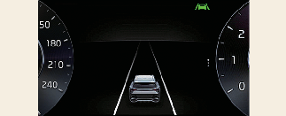 Quando são detetadas linhas de faixa de rodagem (ou limites da estrada), as linhas da faixa de rodagem no painel de instrumentos mudam de cinzento para branco e a luz indicadora verde (