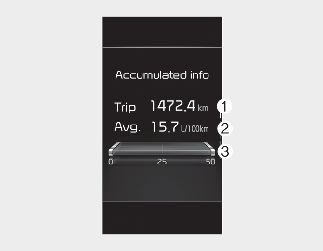 This display shows the trip distance (1), the average fuel efficiency (2), and the instant fuel economy (3) information once per one ignition cycle.