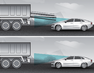 Si le véhicule qui précède a une charge qui dépasse à l'arrière de la cabine ou si le véhicule qui précède a une garde au sol plus élevée, une attention particulière supplémentaire est requise. L’assistance à l’évitement de collision avant peut ne pas être en mesure de détecter le chargement qui dépasse du véhicule. Dans ce cas, vous devez conserver une distance de freinage de sécurité par rapport à l’objet le plus à l’arrière et, si nécessaire, corriger le volant et appuyer sur la pédale de frein pour réduire la vitesse et garder une distance de sécurité.