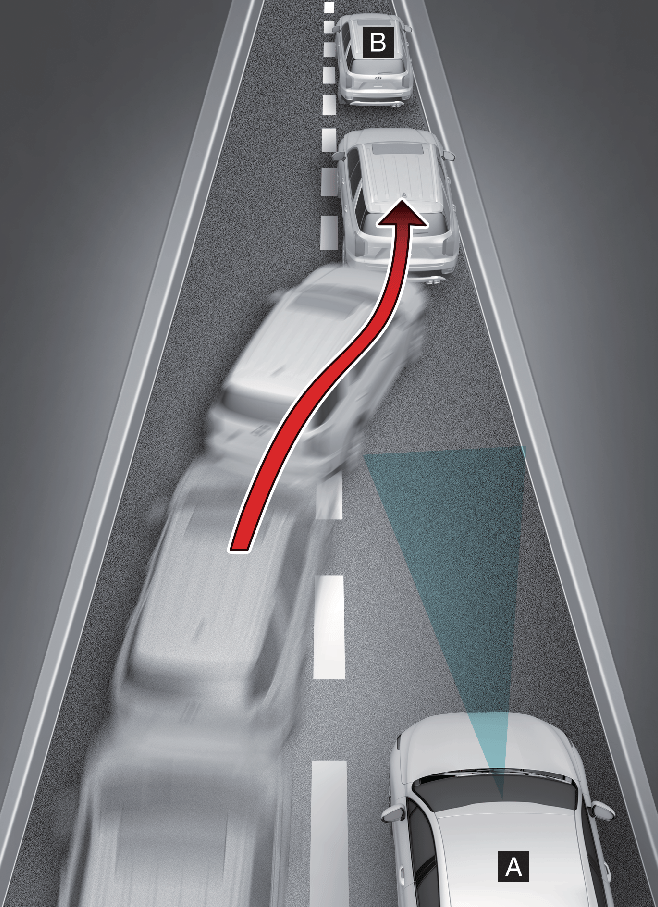 L’assistance à l’évitement de collision avant peut ne pas détecter immédiatement le véhicule lorsqu’il se rabat brusquement. Dans ce cas, vous devez conserver une distance de freinage appropriée et, si nécessaire, corriger le volant et appuyer sur la pédale de frein pour réduire la vitesse et garder une distance de sécurité.
