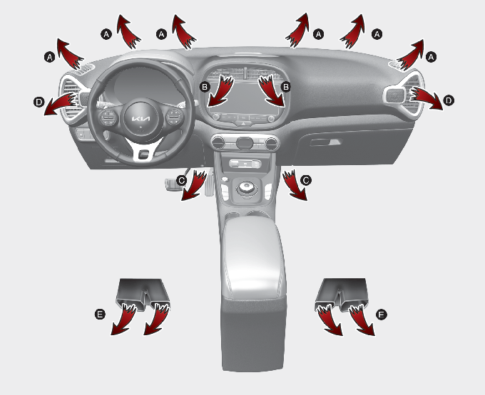 Η ροή αέρα των αεραγωγών εξόδου της 2ης σειράς ελέγχεται από το μπροστινό σύστημα κλιματισμού και παρέχεται μέσω του εσωτερικού αεραγωγού του δαπέδου (E).