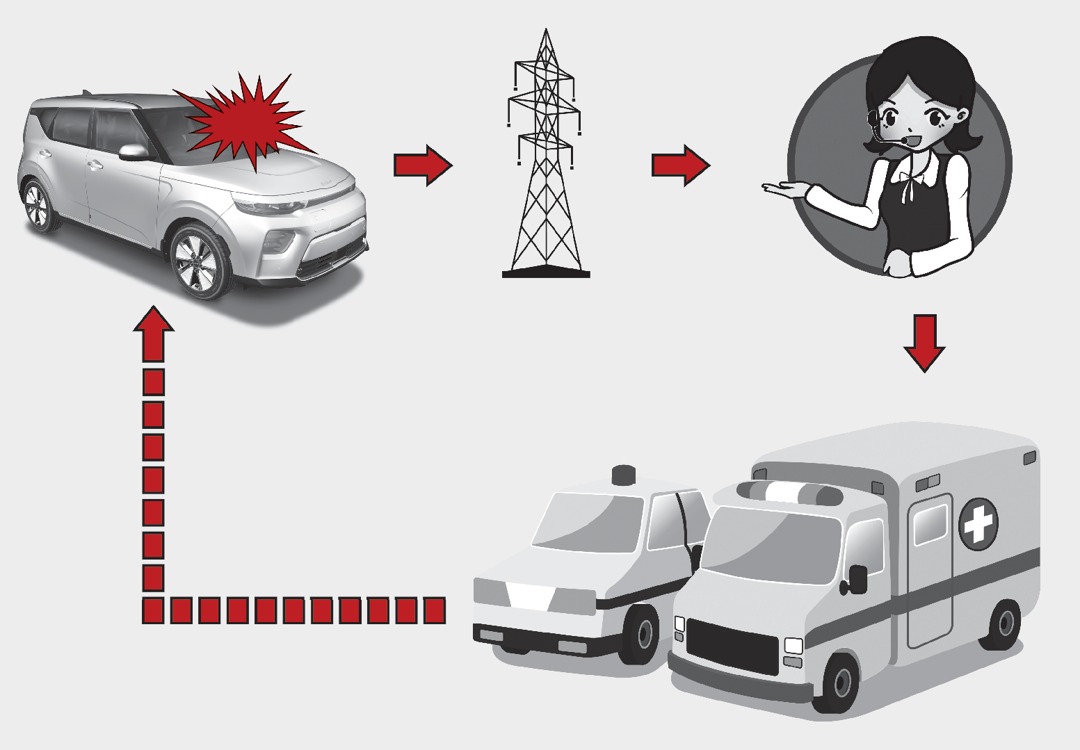 ** Ο όρος «Άλλα ατυχήματα» σημαίνει οποιαδήποτε ατυχήματα στους δρόμους της Ευρώπης (μόνο σε χώρες με ρύθμιση σε αυτό το σύστημα) που είχαν σαν αποτέλεσμα τραυματίες ή/και αναγκαιότητα παροχής βοήθειας. Σε περίπτωση ατυχήματος, είναι απαραίτητο να σταματήσετε το αυτοκίνητο, να πατήστε το κουμπί SOS (η θέση του κουμπιού αναφέρεται στην εικόνα του κεφαλαίου "Πανευρωπαϊκό σύστημα eCall (ΕΑΝ ΥΠΑΡΧΕΙ)") στο Εγχειρίδιο κατόχου. Όταν πραγματοποιείται μια κλήση, το σύστημα συλλέγει πληροφορίες σχετικά με το αυτοκίνητο (από το οποίο πραγματοποιήθηκε η κλήση) και μετά συνδέει το αυτοκίνητο με έναν υπάλληλο του Κέντρου λήψης κλήσεων έκτακτης ανάγκης (PSAP) για να ενημερωθεί για τον λόγο της κλήσης έκτακτης ανάγκης.