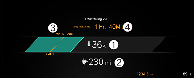 Wenn die Ladung der Hochspannungsbatterie den eingestellten Entladegrenzwert (%) erreicht, wird der Betrieb gestoppt und eine Warnmeldung auf dem Kombiinstrument angezeigt. Für den V2L-Betrieb stellen Sie die Entladegrenze (%) niedriger als die aktuelle Batterieladung ein.