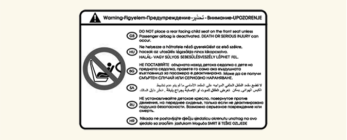 Airbag-Warnschilder weisen den Fahrer und die Insassen auf mögliche Risiken des Airbag-Systems hin.