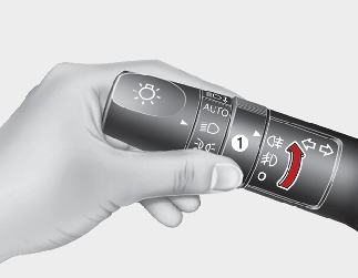 لتشغيل مصباح الضباب الخلفي، من الممكن إدارة مفتاح مصباح الضباب الخلفي (1) إلى وضع ON (تشغيل)، عندما يكون المصباح الأمامي في وضع ON (تشغيل) أو مصباح الضباب الأمامي ومصباح الركن في وضع ON (تشغيل).