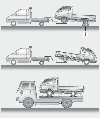 إذا كان الجر في حالات الطوارئ ضروريًا، فنوصي بإجراء ذلك من خلال أحد وكلاء Kia المعتمدين أو خدمة شاحنة الجر التجارية. إجراءات الرفع والقطر الصحيحة ضرورية لمنع تلف السيارة. يوصى باستخدام الدليات المزودة بعجلات (١) أو المعدات المستوية.