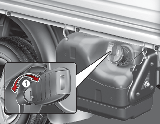 افتح غطاء مفتاح غطاء فتحة ملء الوقود بنظام الاختزال الحفزي الانتقائي (١). أدخل المفتاح ثم أدره 90 درجة عكس اتجاه عقارب الساعة، ثم انزع المفتاح بإدارته إلى وضعه الأصلي.