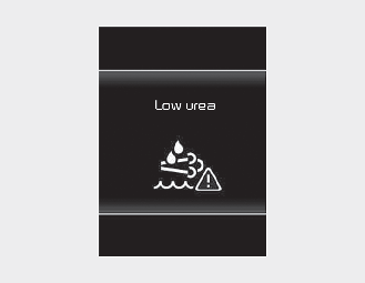 عند ظهور رسالة "Low Urea" (انخفاض يوريا) أو رسالة "Refill Urea" (إعادة التزود بيوريا)، فيجب إضافة مقدار كافي من محلول يوريا. عندما تظهر رسالة "Refill Urea in 000 km or vehicle will not start" (أعد التزود بيوريا خلال 000 كم وإلا فلن يتم تشغيل السيارة)، فيجب إعادة ملء مقدار كافي من محلول يوريا.
