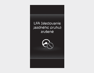 Ak vodič stále nemá ruky na volante ani po výstrahe pre ruky mimo volantu, zobrazí sa výstražné hlásenie „Lane Follow Assist (LFA) canceled“ (Pomocník udržania sa v jazdnom pruhu je zrušený) a Lane Follow Assist (Pomocník udržania sa v jazdnom pruhu) sa automaticky zruší.