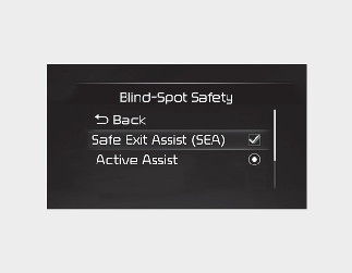 將 ENGINE START/STOP(引擎發動/熄火)按鈕置於 ON 位置,從設定功能表中選擇「駕駛輔助→盲點安全→安全離座輔助」以開啟安全離座輔助並取消選擇以關閉該功能。