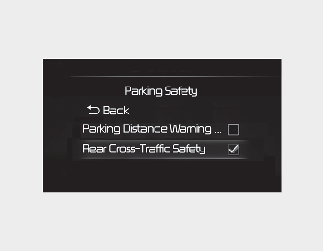 將 ENGINE START/STOP(引擎發動/熄火)按鈕置於 ON 位置,從設定功能表中選擇「駕駛輔助→停車安全→後方橫向安全」以開啟後方橫向防撞輔助並取消選擇以關閉功能。