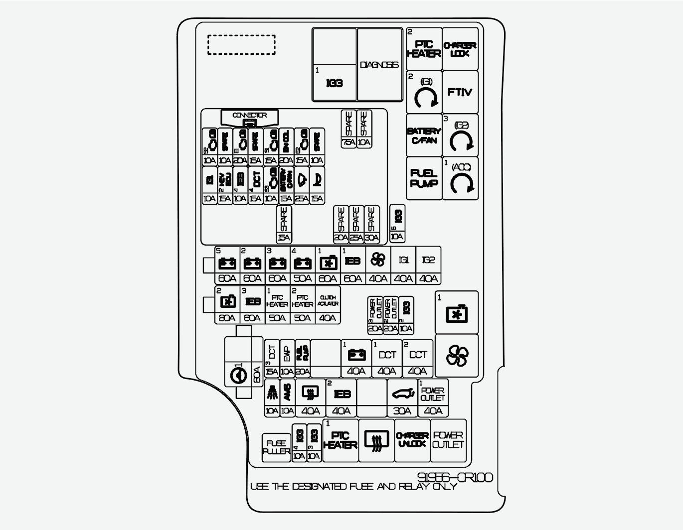 Blok zaciskowy ICU (nazwa bezpiecznika: TAIL GATE, P/WDW RH, P/WDW RH, P/SEAT DRV, S/HEATER FRT, IG3, P/SEAT PASS, MDPS (elektryczne wspomaganie kierownicy), SUNROOF 2, SUNROOF 1) |
