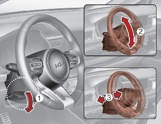 Če želite spremeniti kot nagiba volana, povlecite ročico za sprostitev zapaha navzdol (1), prilagodite volan na želeni kot (2) in višino (3, če je na voljo) ter ročico za sprostitev zapaha povlecite navzgor, da se volan zaklene v položaju. Naklonski kot volana prilagodite pred vožnjo.