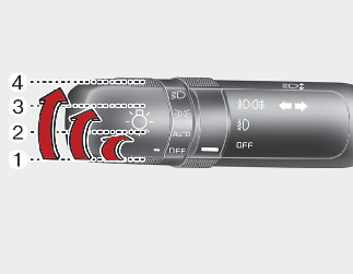 Če je stikalo luči v položaju sprednjih žarometov (3. položaj), svetijo sprednji žarometi, zadnje luči, pozicijske luči, luči za osvetlitev registrske tablice ter instrumentne plošče.