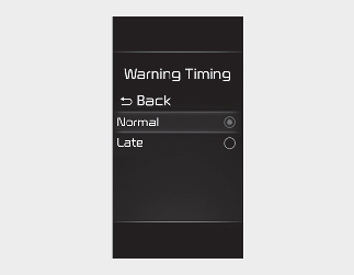 Ko sta stikalo za vžig ali gumb ENGINE START/STOP (Zagon/ustavitev motorja) v položaju »ON« (Vklop), v meniju »Settings« (Nastavitve) izberite »Driver Assistance« (Pomoč vozniku) »Warning Timing« (Čas opozorila), da spremenite začetni čas za aktiviranje opozorila za sistem varnosti pri ovirah za vozilom.