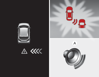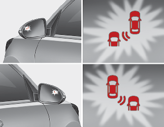Da opozori voznika na bližajoče se vozilo z zadnje leve/desne strani vozila, bo opozorilna lučka zunanjega vzvratnega ogledala utripala in na sklopu instrumentov se bo pojavilo opozorilo. Hkrati se bo oglasilo zvočno opozorilo. Če deluje zaslon za pogled nazaj, se bo opozorilo pojavilo tudi na zaslonu informacijsko-razvedrilnega sistema. (če je na voljo)