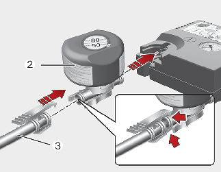 Odvijte pokrovček ventila poškodovanega kolesa in na ventil privijte polnilno cev (3) stekleničke s tesnilnim sredstvom.