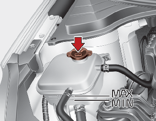 Ko je motor hladen, mora biti nivo hladilne tekočine med oznakama MAX in MIN (F in L), ki sta vtisnjeni na strani posode za hladilno tekočino.