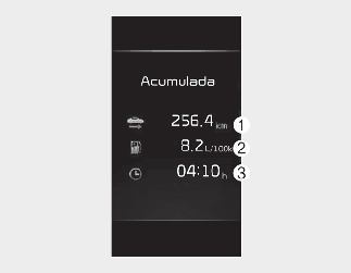 Muestra la distancia del recorrido acumulada (1), el consumo medio de combustible (2) y el tiempo total de conducción (3).