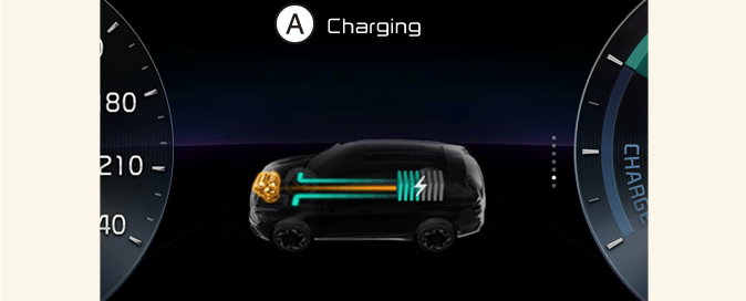 Układ hybrydowy informuje kierowcę o przepływie energii w poszczególnych trybach pracy. Podczas jazdy bieżący przepływ energii jest podawany w 11 trybach.