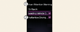 Po uruchomieniu pojazdu należy zaznaczyć lub odznaczyć opcję Wspomaganie kierowcy → DAW (Powiadamianie o zmęczeniu kierowcy) w menu ustawień, aby wybrać funkcje, które mają działać.